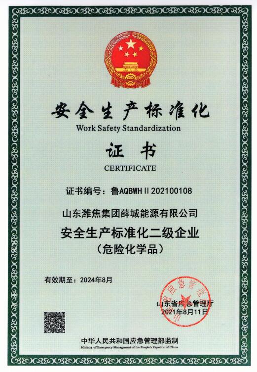 近日,山東省應(yīng)急管理廳發(fā)布山東危險化學(xué)品從業(yè)單位二級安全標(biāo)準(zhǔn)化達(dá)標(biāo)公告,山東濰焦集團(tuán)薛城能源有限公司順利通過二級安全生產(chǎn)標(biāo)準(zhǔn)化審核認(rèn)定。
